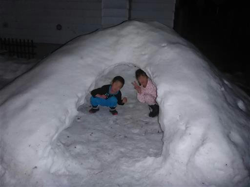 子供達はかまくらで遊んでいる。季節外れの雨でだいぶ小さくなってしまったらしい。