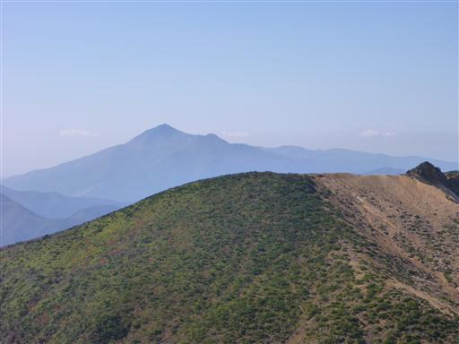 荒涼とした山頂部と、奥には吾妻山。