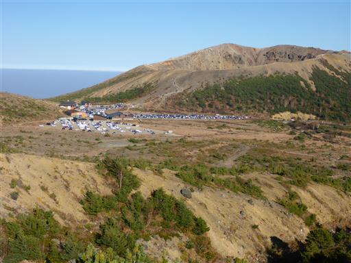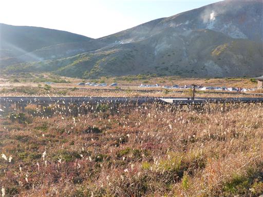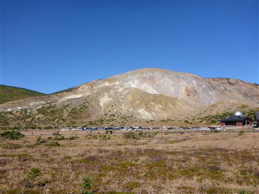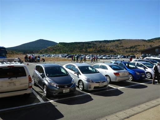 浄土平の大駐車場に到着。次々と車が入ってくる。