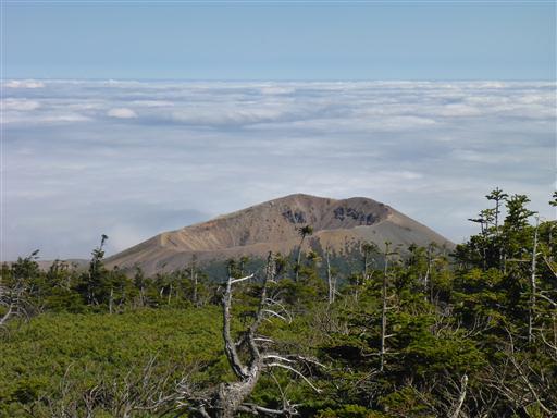一切経山の背後に見える山影は蔵王山だ。