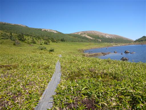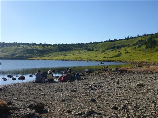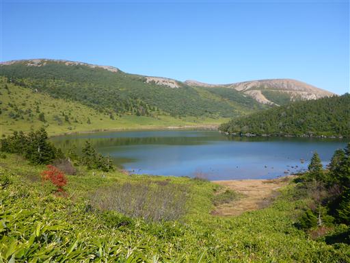 湖の反対側は眩しい笹原の斜面が広がっている。