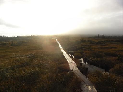 どこまでも続く湿原、その中の一本の木道をただ1人歩いていく。
