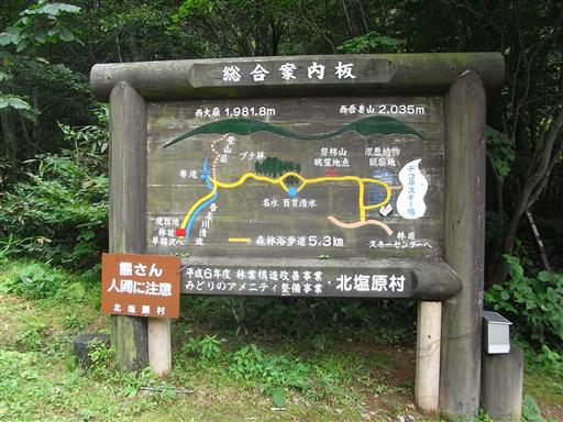 「熊さん人間に注意」という謎の看板が立つ。