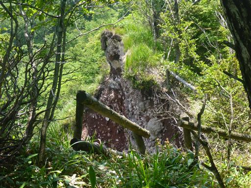 昼食をとったら山頂を出発。崩壊地では赤い土がむき出しになっている。