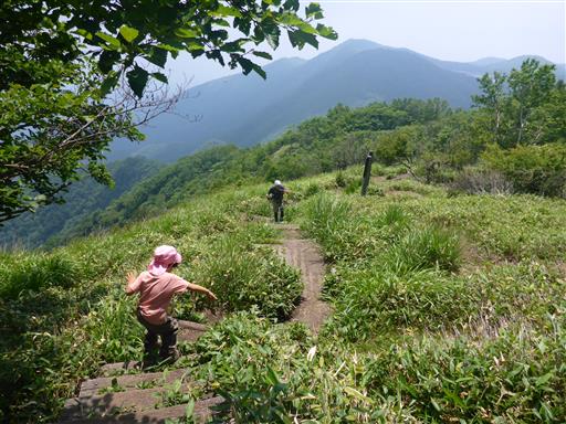 稜線歩きも急な階段道。息子は手をつないでジャンプして下りている。