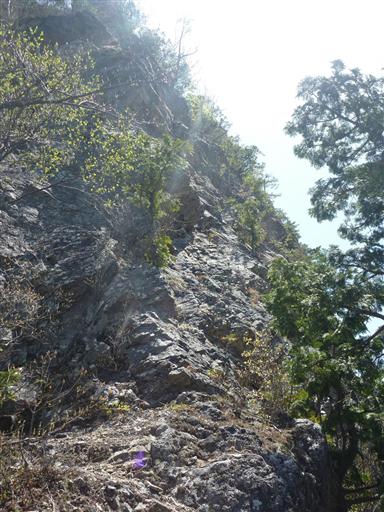 1583m峰前衛峰の岩場。ロープが上から垂れ下がっている。