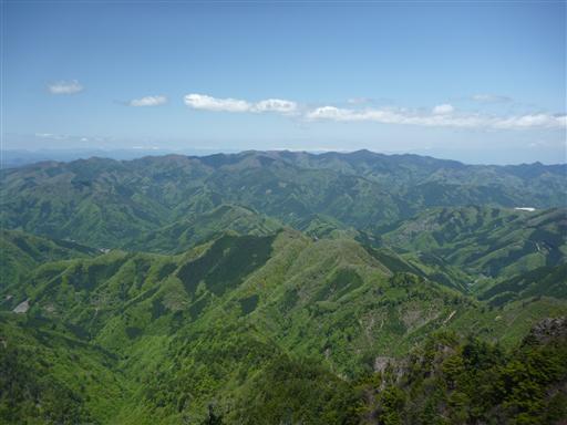 振り返ると今まで歩いてきた赤岩尾根のギザギザの稜線が見渡せる。