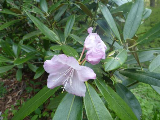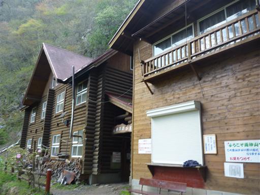 小屋前に咲くシャクナゲの花。ほとんどが蕾だが1輪だけ咲いている。