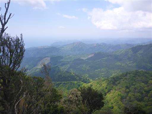 一角の展望が開ける。だいぶ霞んでいるが、山々と海が見渡せる。