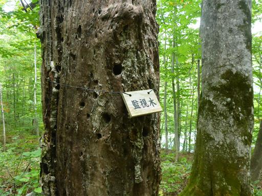 立ち枯れた木には「監視木」と記載されている。