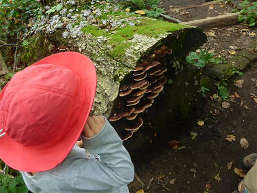 倒木にキノコがたくさん生えている。