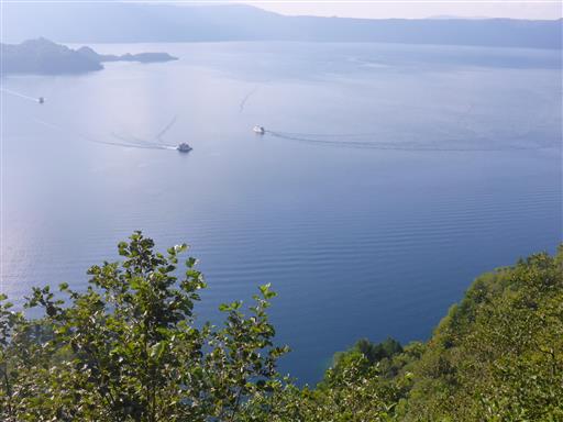 湖上には遊覧船がたくさん見られる。湖の色はきれいな青色だ。