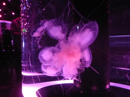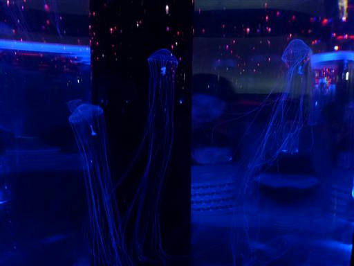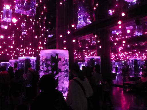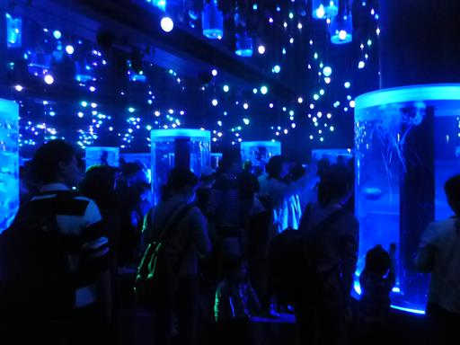 クラゲの展示ルーム。水槽や照明が独特で、壁は鏡になっている。