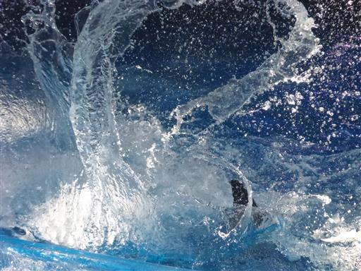イルカが水槽の周りをまわって、尾びれで水をかけ始める。