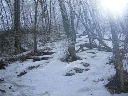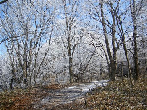 岩の上部に登る。辺りの木々は真っ白に染まっている。