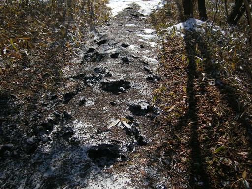 登山道はがっちり凍りついているが、中は空洞なので所々に穴があいている。