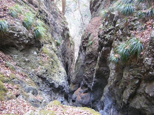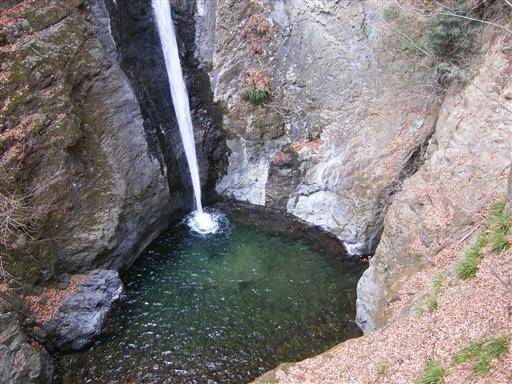 滝から落ちた水は、鋭いV字渓谷を流れていく。