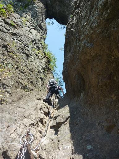 トラバースした後は、穴に向かって鎖場を登っていく。