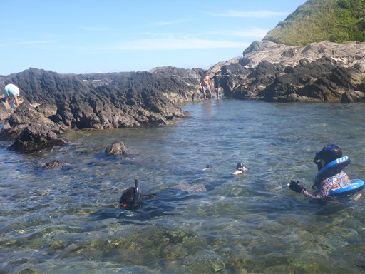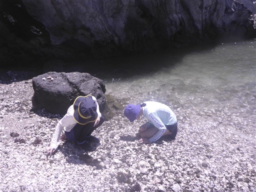 シュノーケリングをしたり、浮き輪に乗って波に揺られたり、カニをとったり、貝殻を探したり