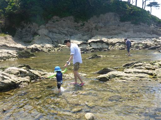 息子は最初怖がっていたが、手を繋いで水に入る。