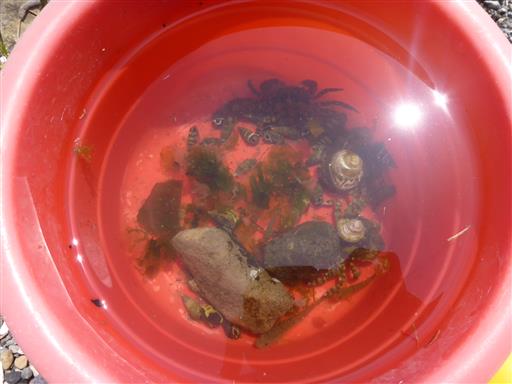 娘は、ヤドカリを捕まえてはバケツに入れている。