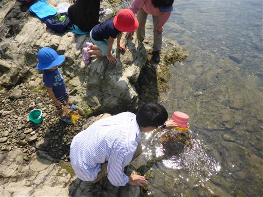 生物を探す。ハゼはたくさん見つかるが、カニがなかなか見つからない。
