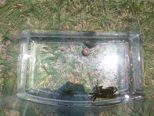 捕まえたカニ。比較的大きめのものが獲れた。魚は速すぎて全く手も足も出ず。