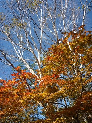 美しく色づいたモミジと白い幹の組み合わせが美しい。