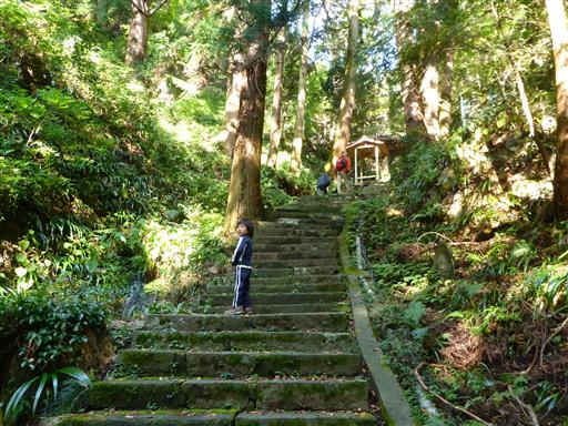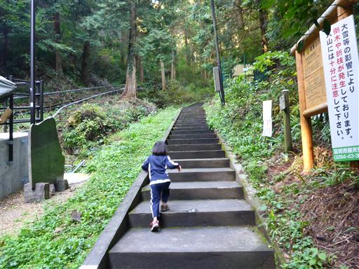 準備を整えたら登山開始。最初は元気いっぱいに石段を登っていく。