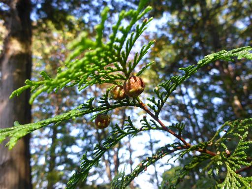 檜の実が地面に落ちていたので、実がなっているところを娘と探してみると見つかった。