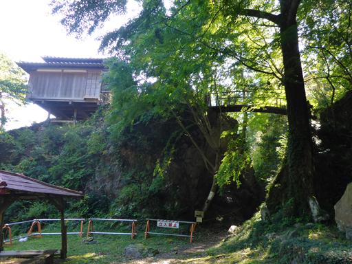 岩の上に橋が架かっていて、その先の断崖に建物が建っている。