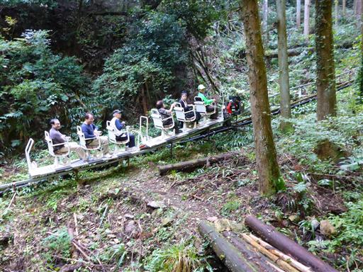 駐車場近くの東屋で休憩していると、意外にもモノレールに乗った人たちが上っていく。