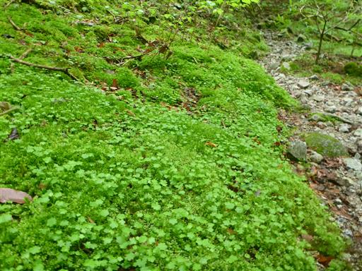 登山道の周囲に広がる苔。苔に混ざって小さな葉も一面に広がっている。