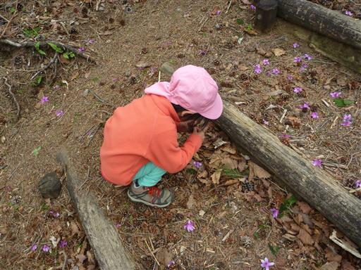 しゃがみこんで、花びらや松ぼっくりを拾っている。