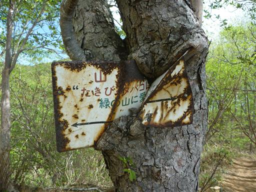 木に飲み込まれた標識。少し痛々しい。