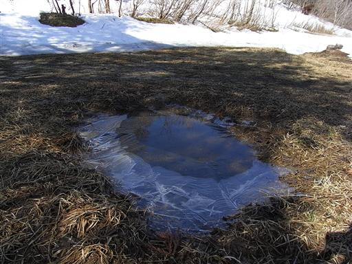 水たまりは凍りついている。昼間は暑いけれど、朝は相当に冷えそう。