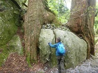 ![]() | 伯耆大山 | 2022.05.02 | 大神山神社にある杉。大きな石を2つの木の根が挟み込んでいる。 |