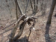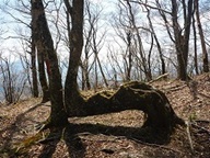 ![]() | 三国山 | 2013.04.13 | 途中で折れ曲がった木。腰かけるのに都合が良さそうな形だが、座ると折れそうだ。 |