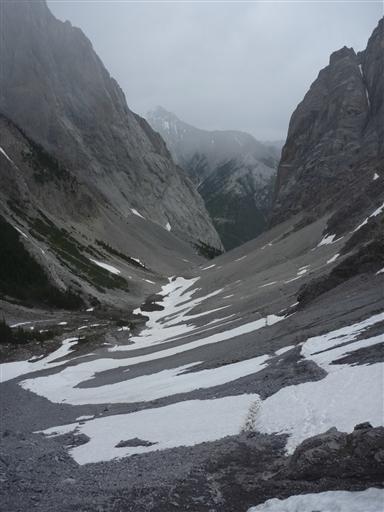ここから道は急降下。雪の残る斜面を下っていく。