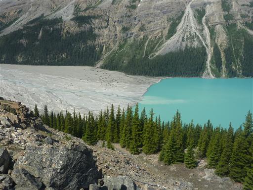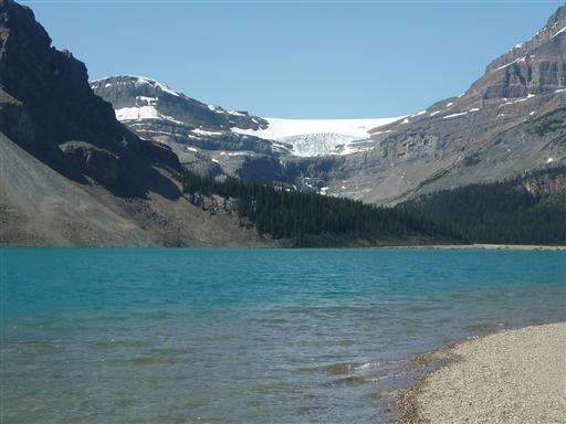 この湖は非常にきれいな青色をしている。背後に見えるのはボウ氷河。