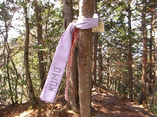 山頂にはKUMOと書かれた布が巻きつけられている。