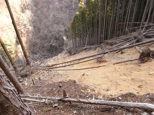 たとえ倒木がなくてもかなり急傾斜の道なので、野鳥観察どころではないだろう。
