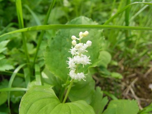 登山道脇に咲くマイヅルソウ。ハート形の葉をつける。