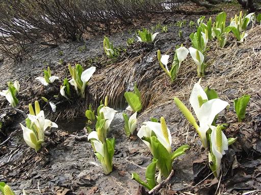 豊富に残る残雪の近くには、尾瀬で見られなかった水芭蕉がたくさん咲いている。