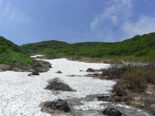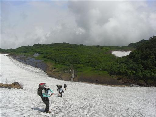 登山道は雪の下に隠れているので、雪渓を登っていく。