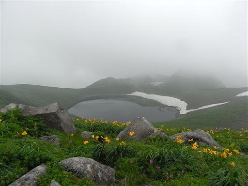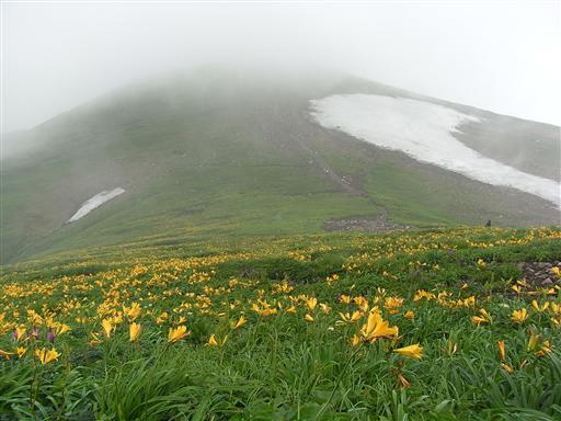なだらかな稜線を歩いて行くと、目の前にニッコウキスゲの大群落が現れる。