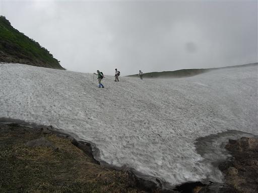 昨日通った急傾斜の雪渓は完全に凍りついていて、