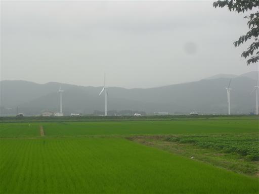 車窓からは風車が見えている。なぜか羽は全て止まっている。