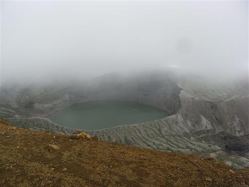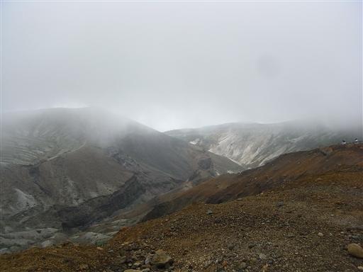 刈田岳から熊野岳に向かう途中、雲に覆われていた御釜が姿をあらわす。
