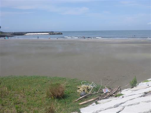 砂浜から湯気が出ている。太陽が出てきて、急に砂浜が熱せられているのだろう。